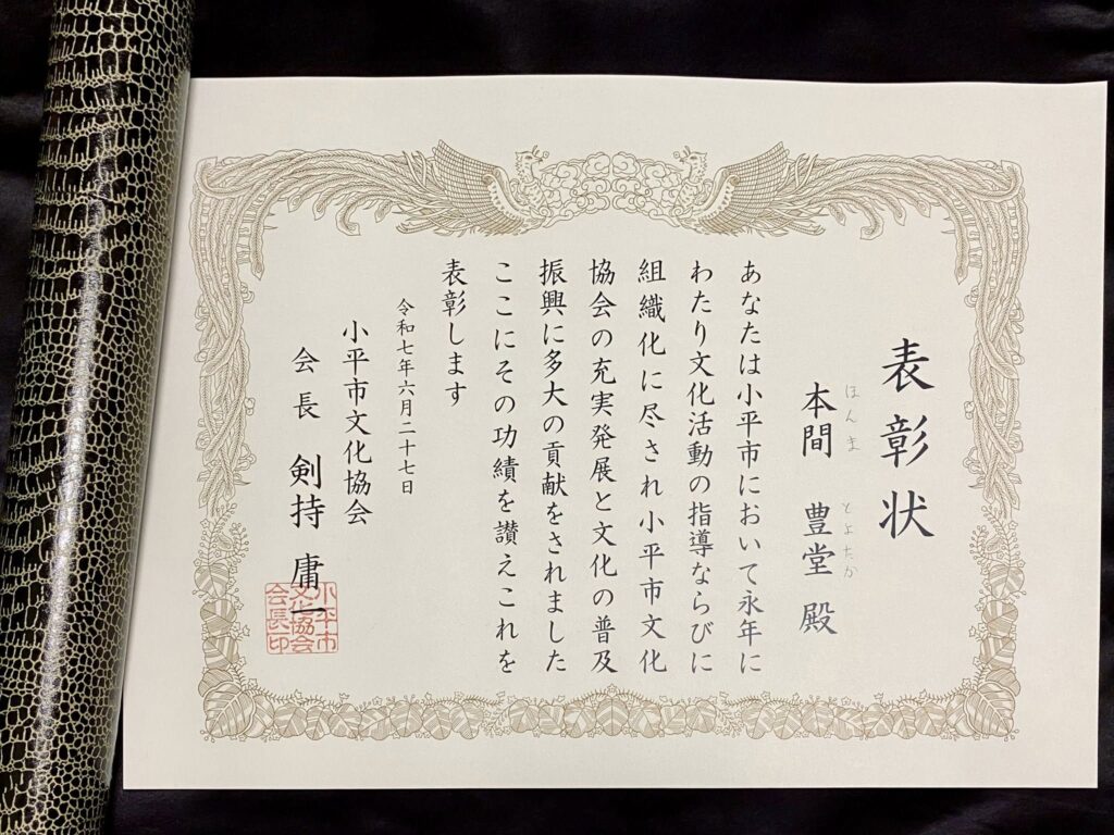 本間豊堂(ほんま とよたか)氏が、「小平市文化協会 文化功労者」として表彰 されましたことをご報告申し上げます。
